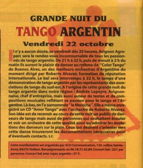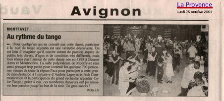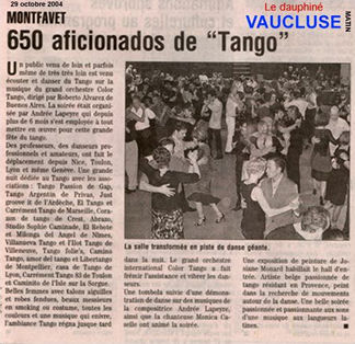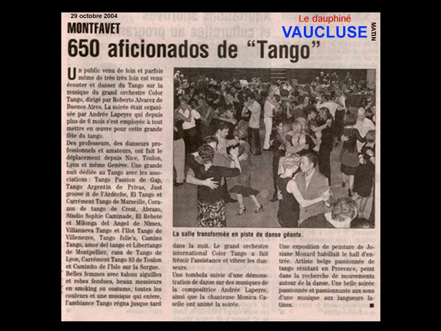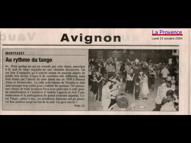 Consulter les photos 2006 Color Tango à Avignon 2005 Mars 2005 Color Tango à Avignon 2004 Color Tango à Nîmes 2004 Juillet 2004 Décembre 2003 Mars 2003